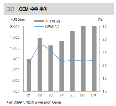 À¯Á¤Çö ´ë½ÅÁõ±Ç ¿¬±¸¿øÀº "¿µ¿ø¹«¿ªÀÇ 1ºÐ±â ¸ÅÃâ¾×Àº 8675¾ï¿øÀ¸·Î Àü³â µ¿±â ´ëºñ 7% Áõ°¡Çϰí, ¿µ¾÷ÀÌÀÍÀº 1210¾ï¿øÀ¸·Î 47% ´Ã¾î³¯ °ÍÀ¸·Î ÃßÁ¤ÇÑ´Ù"¶ó¸ç "OEM ºÎ¹®Àº ´Þ·¯ ±âÁØ ¸ÅÃâÀÌ ¾à 7% ¼ºÀåÇϰí ȯÀ² È¿°ú±îÁö ´õÇØÁö¸ç ¿øÈ ±âÁØ 8% ¼ºÀåÇÒ °Í Àü¸ÁÇÑ´Ù"¶ó°í ³»´ÙºÃ´Ù. ÀÌ¾î ¾ÆÅ©Å׸¯½º¿Í VFC µî ÁÖ¿ä °í°´»çÀÇ ¾ÈÁ¤ÀûÀÎ ¼ºÀå¼¼°¡ ¼öÁÖ Áõ°¡·Î À̾îÁö¸é¼ ¼öÀͼºµµ °³¼±µÉ °ÍÀ¸·Î Àü¸ÁÇß´Ù.