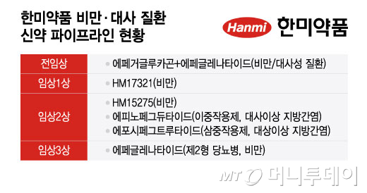 ±ÙÀ° Áõ°¡ ±âÀüÀÇ ºñ¸¸Ä¡·áÁ¦ HM17321Àº Çѹ̾àǰÀÌ '°è¿ ³» ÃÖÃÊ' ºñ¸¸ ½Å¾àÀ¸·Î °³¹ß ÁßÀÎ ¹°ÁúÀÌ´Ù. ¹Ì±¹ ½ÄǰÀǾ౹(FDA)À¸·ÎºÎÅÍ ÀÓ»ó 1»ó ½ÃÇè°èȹ(IND) ½ÂÀÎÀ» ¹Þ¾Æ ÀÓ»ó 1»óÀ» ÁøÇà ÁßÀÌ´Ù. Çѹ̾àǰÀº ½ÄÀÌÀ¯µµ ºñ¸¸ µ¿¹° ¸ðµ¨¿¡¼ HM17321 Åõ¾à ½Ã ±ÙÀ° ³» mTOR(¶óÆÄ¸¶À̽ŠǥÀû ´Ü¹éÁú) °æ·Î Ȱ¼ºÈ¸¦ ÅëÇØ ±Ù ¼ºÀåÀ» ÃËÁøÇϰí, Áö¹æ Á¶Á÷¿¡¼´Â Áö¹æºÐÇØ¸¦ À¯µµÇÏ´Â µ¿½Ã¿¡ Áö¹æÇÕ¼ºÀ» ¾ïÁ¦ÇØ Áö¹æ·®ÀÌ °¨¼ÒÇÏ´Â °á°ú¸¦ È®ÀÎÇß´Ù. ¶Ç º¹° ³» Æ÷µµ´ç ºÎÇÏ °Ë»ç(ipGTT)¿Í Àν¶¸° ³»¼º °Ë»ç(ITT) °á°ú, HM17321 Åõ¿©±ºÀº ¼¼¸¶±Û·çŸÀ̵å(ºñ¸¸¾à À§°íºñ ¼ººÐ) ´ëºñ ¿ì¼öÇÑ Ç÷´ç Á¶Àý ´É·ÂÀ» ³ªÅ¸³Â´Ù.