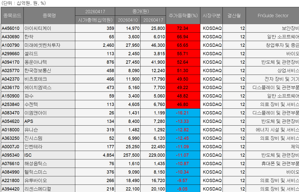 ¹ÝµµÃ¼ ¹× ÀüÀÚÀåºñ ¾÷Á¾µµ °¼¼¸¦ º¸¿´´Ù. µ¿¿î¾Æ³ªÅØÀº 2¸¸7450¿ø¿¡¼ 4¸¸1900¿øÀ¸·Î 52.64% »ó½ÂÇß°í, ºñÃ÷·ÎÅ×Å©µµ 1¸¸1900¿ø¿¡¼ 1¸¸7790¿øÀ¸·Î 49.50% ¿Ã¶ú´Ù. ¿¡ÀÌÄ¡¿¥³Ø½º(49.22%), ¼öÁ¨ÅØ(46.80%) µîµµ ¿À¸§¼¼¸¦ ³ªÅ¸³Â´Ù. ¾÷Á¾ Àü¹ÝÀÇ ½ÇÀû °³¼± ±â´ëº¸´Ù´Â Å׸¶ È®»ê°ú ¼ö±Þ ÁÖµµ Àå¼¼ ¼º°ÝÀÌ °ÇÏ´Ù´Â Æò°¡´Ù.