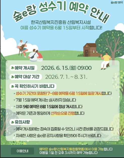 »ê¸²Ã» Çѱ¹»ê¸²º¹ÁöÁøÈï¿øÀº ¿©¸§Ã¶ ¼º¼ö±âÀÎ 7¿ù1ÀϺÎÅÍ 8¿ù31ÀϱîÁöÀÇ »ê¸²º¹Áö¼ºñ½º ÀÌ¿ë ¿¹¾àÀ» ¿À´Â 6¿ù15ÀÏ ¿ÀÀü 9½Ã »ê¸²º¹ÁöÅëÇÕÇ÷§Æû '½£e¶û'À» ÅëÇØ Àϰý °³½ÃÇÑ´Ù°í 20ÀÏ ¹àÇû´Ù.