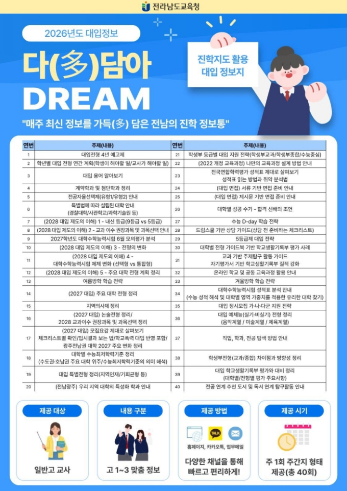 Àü³²±³À°Ã»ÀÌ ±Þº¯ÇÏ´Â ´ëÀÔ È¯°æ¿¡ ¼±Á¦ÀûÀ¸·Î ´ëÀÀÇϰí Çб³ ÇöÀåÀÇ ÁøÇÐÁöµµ ¿ª·®À» °ÈÇϱâ À§ÇØ ¸ÂÃãÇü ´ëÀÔ Á¤º¸Áö '´Ù(Òý)´ã¾Æ DREAM'À» ¹ß°£¡¤¿î¿µÇÑ´Ù°í 20ÀÏ ¹àÇû´Ù.