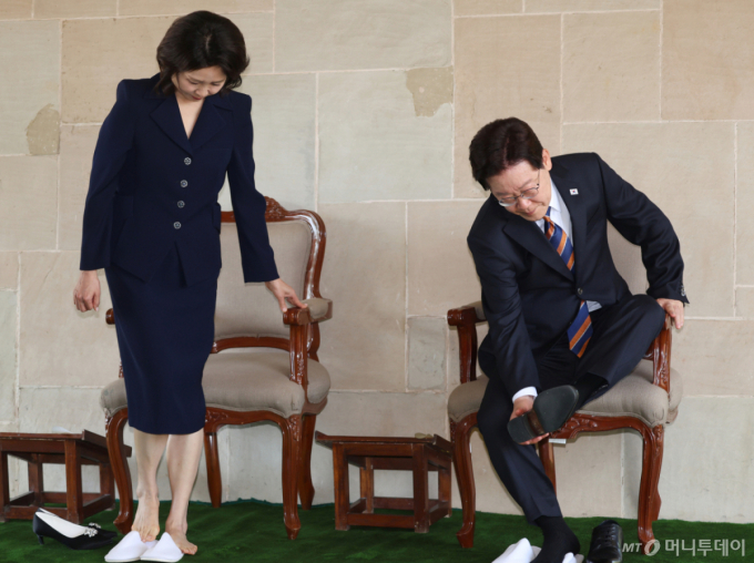 ÀÌ ´ëÅë·ÉÀº ºÎºÎ´Â ¹¦´Ü ÀÔ±¸ ¾Õ¿¡ ºñÄ¡µÈ ÀÇÀÚ¿¡ ¾É¾Æ ±¸µÎ¸¦ ¹þ°í ÁغñµÈ ÇϾá»ö ½½¸®ÆÛ¸¦ Âø¿ëÇß´Ù. °£µð Ãß¸ð°ø¿øÀº ¸Ç¹ß ȤÀº ½½¸®ÆÛ¸¦ Âø¿ëÇØ¾ß ÀÔÀåÀÌ °¡´ÉÇÏ´Ù. ÀÌ ´ëÅë·É ºÎºÎ´Â ÀÌÈÄ µµº¸·Î ¹¦¿ª±îÁö À̵¿ÇØ ÁغñµÈ ÈȯÀ» ÇâÇØ ¹¬³ä, ÁغñµÈ ºÓÀº ²ÉÀÙÀ» µÎ¼ÕÀ¸·Î µé¾î Èð»Ñ·È´Ù.