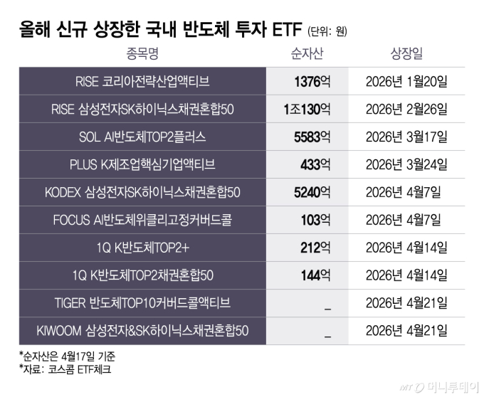 ÀÚ»ê¿î¿ë»çµéÀÌ ¿ÃÇØ ¾Õ´ÙÅõ¾î »ï¼ºÀüÀÚ¿Í SKÇÏÀ̴нº¸¦ ´ãÀº ±¹³» ¹ÝµµÃ¼ ÅõÀÚ ETF(»óÀåÁö¼öÆÝµå)¸¦ Ãâ½ÃÇϰí ÀÖ´Ù. ½´ÆÛ»çÀÌŬ¿¡ µû¶ó ¹ÝµµÃ¼ÁÖµéÀÇ ¿µ¾÷ÀÌÀÍÀÌ ±ÞÁõÇÏ¸é¼ °ü·Ã »óǰÀ¸·Î ÀÚ±ÝÀÌ ¸ô¸®°í Àֱ⠶§¹®ÀÌ´Ù. »óÀå ¾à µÎ ´Þ ¸¸¿¡ ¼øÀÚ»êÀÌ 1Á¶¿øÀ» µ¹ÆÄÇÑ »óǰµµ ³ª¿Ô´Ù.