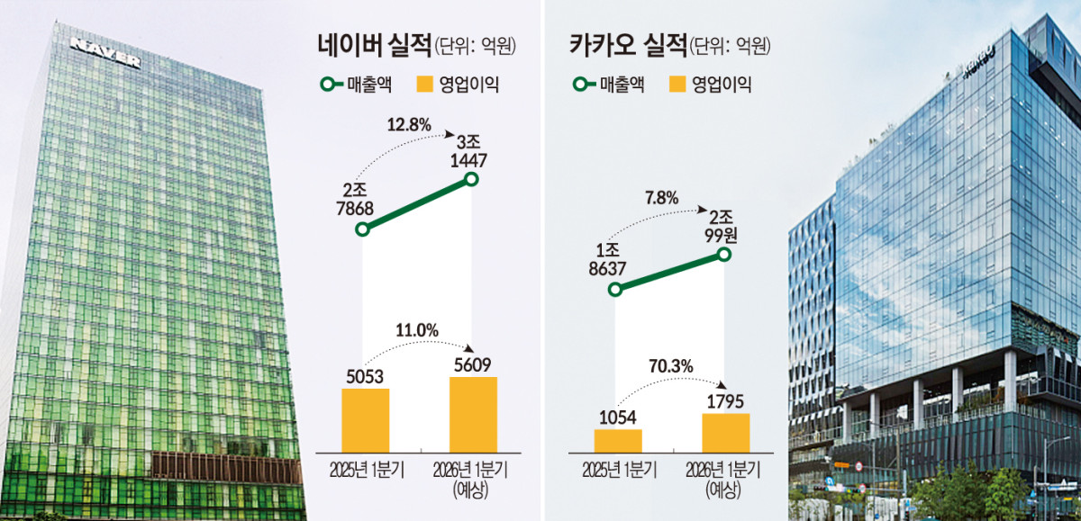 ±¹³» ¾ç´ë Ç÷§ÆûÀÎ ³×À̹ö¿Í īī¿À°¡ ¿ÃÇØ 1ºÐ±â °ßÁ¶ÇÑ ½ÇÀûÀ» ³¾ °ÍÀ¸·Î º¸ÀδÙ. ³×À̹ö´Â Ä¿¸Ó½º »ç¾÷ ¼ºÀå, īī¿À´Â ±¤°í ¼öÀÍ È®´ë ±â¹Ý¿¡¼´Ù. ´Ù¸¸ ³×À̹ö´Â °Ë»ö ±â¹Ý, īī¿À´Â äÆÃ ±â¹Ý¿¡ µ¡ÀÔÈ÷°í ÀÖ´Â ÀΰøÁö´É(AI) »ç¾÷ÀÌ ¾ÆÁ÷ ÅõÀÚ ´Ü°è¿¡ ¸Ó¹°¾î ¼öÀÍȱîÁö´Â ½Ã°£ÀÌ ÇÊ¿äÇÒ °ÍÀ¸·Î °üÃøµÈ´Ù.