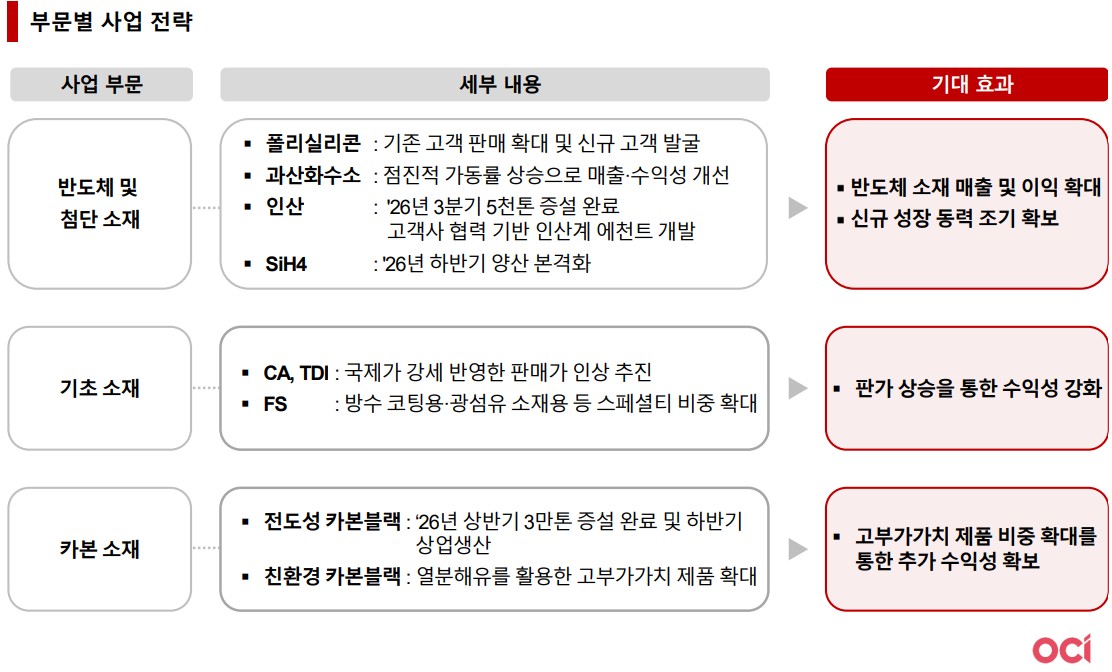 ±âÃʼÒÀç´Â 1ºÐ±â ½ÇÀû ºÎÁøÀÌ ¿ÀÈ÷·Á 2ºÐ±â ¹ÝµîÀÇ ¹è°æÀÌ µÆ´Ù. OCI´Â Åë»ó 2ºÐ±â¿¡ ÁýÁßÇÏ´ø ±º»ê¡¤ÀͻꡤÆ÷Çס¤±¤¾ç °øÀå Á¤±âº¸¼ö¸¦ ¿ÃÇØ´Â ¾÷Ȳ ºÎÁøÀ» °¨¾ÈÇØ 1ºÐ±â·Î ¾Õ´ç°Ü ÁøÇàÇß´Ù. ±× °á°ú 1ºÐ±â ¿ø°¡ ºÎ´ãÀÌ Ä¿Á³Áö¸¸, 2ºÐ±â¿¡´Â Á¤ºñ ±âÀúÈ¿°ú°¡ »ç¶óÁö°í CA¿Í TDI °¡°Ý »ó½ÂºÐÀÌ º»°Ý ¹Ý¿µµÉ Àü¸ÁÀÌ´Ù. ȸ»çµµ 2ºÐ±â º£ÀÌÁ÷ÄɹÌÄ® ½ÇÀûÀÌ °³¼±µÉ °ÍÀ¸·Î ³»´ÙºÃ´Ù.