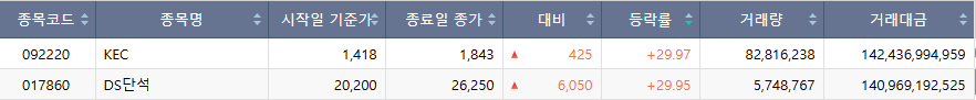 22ÀÏ ÄÚ½ºÇÇ ½ÃÀå¿¡¼ »óÇѰ¡¸¦ ±â·ÏÇÑ Á¾¸ñÀº DS´Ü¼®, KEC´Ù.