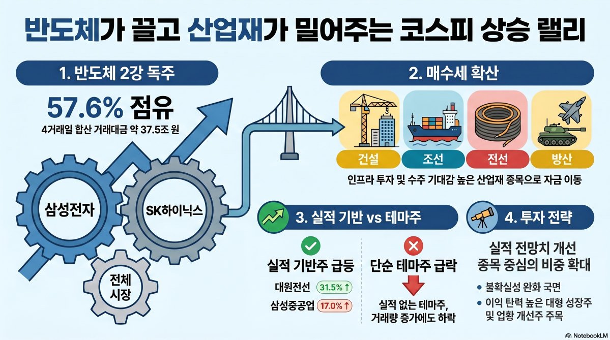 °Å·¡´ë±Ý ±Ô¸ð·Î º¸¸é ½ÃÀåÀÇ ¹«°ÔÁß½ÉÀº ¿©ÀüÈ÷ ¹ÝµµÃ¼ ´ëÇüÁÖ¿¡ ÀÖ¾ú´Ù. »ï¼ºÀüÀÚÀÇ ÃÖ±Ù 4°Å·¡ÀÏ ´©Àû °Å·¡´ë±ÝÀº 18Á¶7596¾ï¿ø, SKÇÏÀ̴нº´Â 18Á¶7076¾ï¿øÀ¸·Î Áý°èµÆ´Ù. µÎ Á¾¸ñ ÇÕ»ê °Å·¡´ë±ÝÀº 37Á¶4672¾ï¿ø¿¡ ´ÞÇß´Ù. ÀÌ´Â °Å·¡·® »óÀ§ 50Á¾¸ñ Àüü °Å·¡´ë±Ý ¾à 65Á¶¿øÀÇ 57.6% ¼öÁØÀÌ´Ù. »ï¼ºÀüÀÚ´Â ÀÌ ±â°£ 3.94%, SKÇÏÀ̴нº´Â 8.60% »ó½ÂÇØ ÄÚ½ºÇÇ Áö¼ö ¹æÇ⼺À» »ç½Ç»ó ¹ÝµµÃ¼°¡ °áÁ¤ÇÑ ¼ÀÀÌ´Ù.
