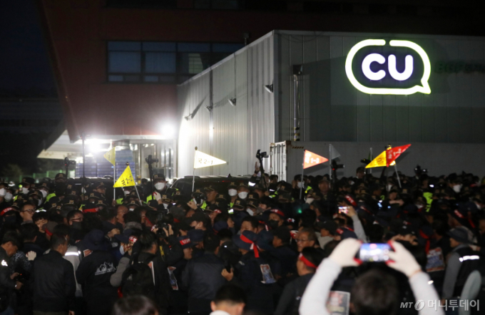 ¹ÎÁÖ³ëÃÑ È¹°¿¬´ë°¡ ÀÌ´Þ ÃʺÎÅÍ CU ¹°·ù¼¾ÅÍ 3°÷°ú °£Æí½Ä »ý»ê °øÀå ÃâÀÔ±¸¸¦ ºÀ¼âÇÏ´Â ºÒ¹ý ÆÄ¾÷À» ÁøÇà ÁßÀÎ °¡¿îµ¥ ÇöÀå¿¡ ÀÖ´Â Á¶ÇÕ¿ø ´ëºÎºÐÀº CU¿Í °è¾àÀ» ¸ÎÀº ¹è¼Û ±â»ç°¡ ¾Æ´Ñ °ÍÀ¸·Î ¾Ë·ÁÁ³´Ù. ȹ°¿¬´ë°¡ °Á¶ÇÑ 'CU ¹è¼Û ±â»çÀÇ Ã³¿ì °³¼±'À̶õ ÆÄ¾÷ ¸ñÀûÀÌ ¹«»öÇÏ´Ù´Â ÁöÀûÀÌ´Ù.