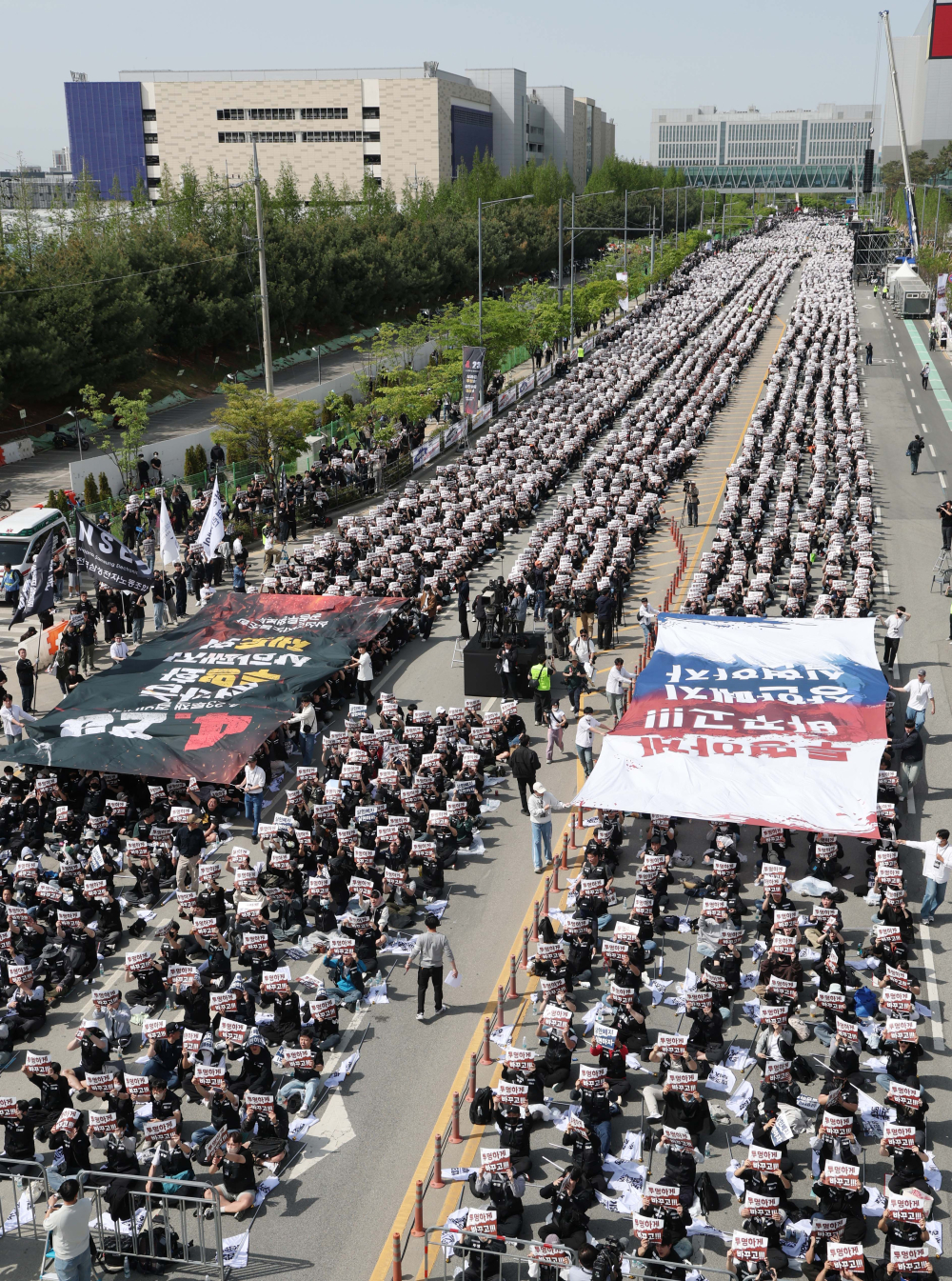 »ï¼ºÀüÀÚÀÇ Ã¹ °ú¹Ý ³ëÁ¶ÀÎ ¡®»ï¼ºÀüÀÚ Ãʱâ¾÷³ëÁ¶¡¯´Â 23ÀÏ °æ±â ÆòÅÃÄ·ÆÛ½º ¾Õ¿¡¼ ´ë±Ô¸ð ÅõÀï°áÀÇ´ëȸ¸¦ ¿°í º»°ÝÀûÀÎ ¼¼ °ú½Ã¿¡ ³ª¼¹´Ù. °æÂû°ú ³ëÁ¶ Ãø Ãß»ê ¾à 4¸¸¸íÀÇ Á¶ÇÕ¿øÀÌ Áý°áÇÑ °¡¿îµ¥, ÇöÀåÀº ¡®°ËÀº»ö Á¶³¢¡¯¸¦ ÀÔÀº ÀÎÆÄ·Î °¡µæ á´Ù. Á¶³¢ Àü¸é¿¡´Â ¡®ÅõÀ°ú ¡®SELU(Ãʱâ¾÷³ëÁ¶)¡¯°¡, Èĸ鿡´Â ¡®»ï¼ºÀüÀÚÁöºÎ¡¯¶ó´Â ¼±¸íÇÑ ¹®±¸°¡ »õ°ÜÁ³´Ù. ³ëÁ¶ ÃøÀº Áö³´ÞºÎÅÍ 4¸¸ÀåÀÇ Á¶³¢¸¦ ¹èºÎÇßÀ¸¸ç, À̸¦ ±Ù¹«½Ã°£ Áß¿¡µµ Âø¿ëÇÏ¸ç »çÃøÀ» ¾Ð¹ÚÇϰí ÀÖ´Ù°í °Á¶Çß´Ù. ³ëÁ¶´Â ¼º°ú±Þ »óÇÑÁ¦ ÆóÁö¿Í ¹èºÐ ±¸Á¶ °³¼± µîÀ» ¿ä±¸Çϸç 5¿ù 21ÀϺÎÅÍ 6¿ù 7ÀϱîÁö 18Àϰ£ÀÇ ÃÑÆÄ¾÷ ÅõÀï °èȹÀÌ ´ã±ä ¡®ÅõÀïÁöħ 2È£¡¯¸¦ ¼±Æ÷Çß´Ù.