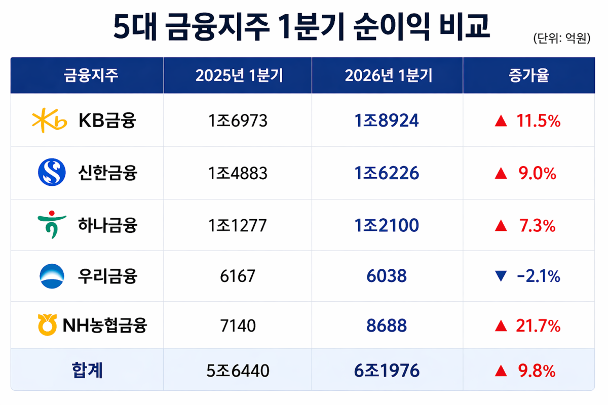 24ÀÏ ±ÝÀ¶±Ç¿¡ µû¸£¸é 5´ë ±ÝÀ¶ÁöÁÖ´Â ¿ÃÇØ 1ºÐ±â 6Á¶1976¾ï¿øÀÇ ¼øÀÌÀÍÀ» ´Þ¼ºÇß´Ù. ÀÌ´Â Àü³â µ¿±â ´ëºñ 9.8% Áõ°¡ÇÑ ¼öÄ¡´Ù. KB±ÝÀ¶ÀÇ 1ºÐ±â ¼øÀÌÀÍÀº 1Á¶8924¾ï¿ø, ½ÅÇѱÝÀ¶Àº 1Á¶6226¾ï¿øÀ¸·Î ³ªÅ¸³µ´Ù. À̾î Çϳª±ÝÀ¶Àº 1Á¶2100¾ï¿ø, ¿ì¸®±ÝÀ¶Àº 6038¾ï¿ø, NH³óÇù±ÝÀ¶Àº 8688¾ï¿øÀÇ ¼øÀÌÀÍÀ» °¢°¢ ±â·ÏÇß´Ù. ¿ì¸®±ÝÀ¶À» Á¦¿ÜÇÏ°í ±ÝÀ¶ÁöÁÖ ´ëºÎºÐÀÌ Àü³â ´ëºñ 7~22% ¼öÁØÀÇ ¼ºÀå·üÀ» º¸¿´´Ù.