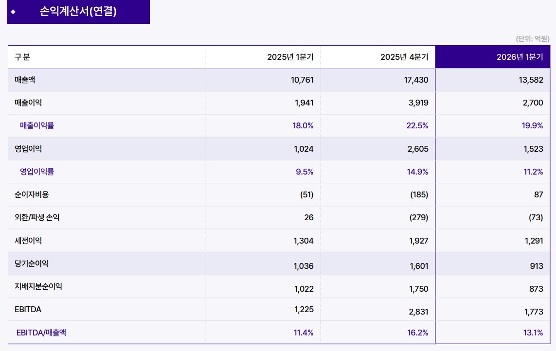 È¿¼ºÁß°ø¾÷ÀÌ 2026³â 1ºÐ±â ¿¬°á ±âÁØ ¸ÅÃâ 1Á¶3582¾ï¿ø, ¿µ¾÷ÀÌÀÍ 1523¾ï¿øÀ» ±â·ÏÇß´Ù°í 24ÀÏ °ø½ÃÇß´Ù. ¸ÅÃâÀº Àü³â µ¿±â ´ëºñ ¾à 26% Áõ°¡ÇßÁö¸¸, ÀüºÐ±â ´ëºñ·Î´Â °¨¼ÒÇß´Ù. ¿µ¾÷ÀÌÀÍ ¿ª½Ã Àü³â ´ëºñ 48.7% Áõ°¡ÇßÀ¸³ª, ÀüºÐ±â(2605¾ï¿ø) ´ëºñ·Î´Â ÁÙ¾ú´Ù.