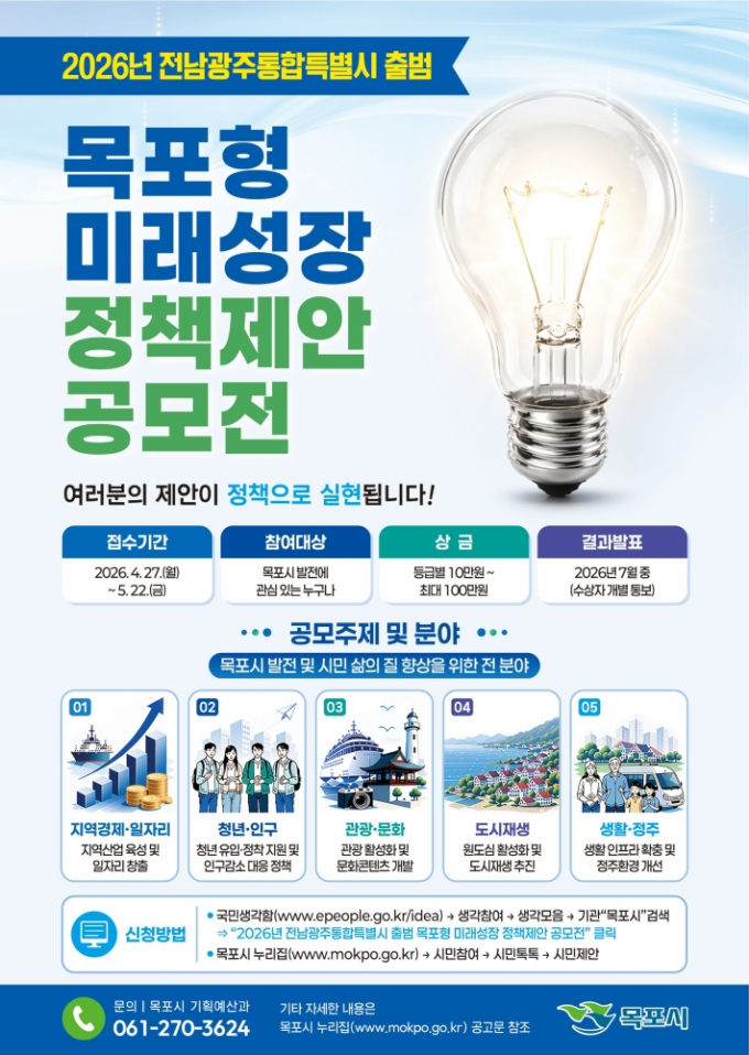 Àü³² ¸ñÆ÷½Ã°¡ Àü³²¡¤±¤ÁÖ ÅëÇÕÆ¯º°½Ã Ãâ¹ü¿¡ ´ëºñÇϰí Áö¿ªÀÇ ¹Ì·¡ ¼ºÀ嵿·ÂÀ» ¹ß±¼Çϱâ À§ÇØ '¸ñÆ÷Çü ¹Ì·¡¼ºÀå Á¤Ã¥Á¦¾È °ø¸ðÀü'À» °³ÃÖÇÑ´Ù°í 27ÀÏ ¹àÇû´Ù.
