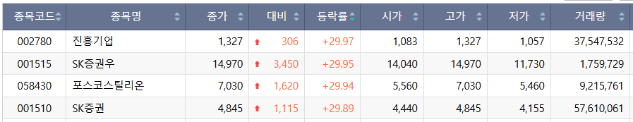 27ÀÏ Çѱ¹°Å·¡¼Ò¿¡ µû¸£¸é ÄÚ½ºÇÇ ½ÃÀå¿¡¼ »óÇѰ¡¸¦ ±â·ÏÇÑ Á¾¸ñÀº ÁøÈï±â¾÷, SKÁõ±Ç¿ì, SKÁõ±Ç, Æ÷½ºÄÚ½ºÆ¿¸®¿ÂÀÌ´Ù.