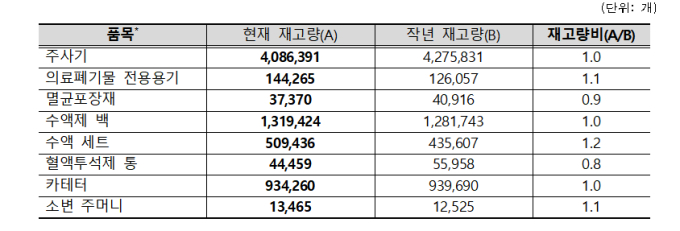 Àü±¹ º´¿øÀÇ ÁÖ»ç±â¿Í ¼ö¾× ¼¼Æ® µî 8°³ ÀÇ·áÁ¦Ç°ÀÇ Àç°í·®ÀÌ Áö³ÇØ¿Í °°°Å³ª ´õ ¸¹Àº ¼öÁØÀÎ °ÍÀ¸·Î ³ªÅ¸³µ´Ù.