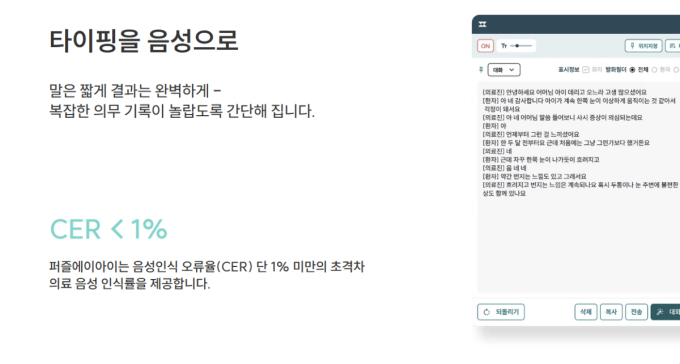 ÆÛÁñGenÀº ÀÇ·áÁøÀÇ À½¼ºÀ» ½Ç½Ã°£À¸·Î ÀνÄÇØ »ý¼ºÇü AI¸¦ ±â¹ÝÀ¸·Î Áø·á ³»¿ëÀ» ¿ä¾à¡¤±¸Á¶ÈÇϰí, ÀüÀÚÀǹ«±â·Ï(EMR)¿¡ ÀÚµ¿ ¿¬µ¿ÇÑ´Ù. º¹ÀâÇÑ ÀÇÇпë¾î°¡ Æ÷ÇÔµÈ ÀÇ·áÁøÀÇ À½¼ºÀ» 98% ÀÌ»óÀÇ ³ôÀº Á¤È®µµ·Î º¯È¯ÇÏ¸ç ¿Ü·¡, º´µ¿, ¼ö¼ú½Ç, ÁßȯÀÚ½Ç µî ´Ù¾çÇÑ Áø·á ȯ°æ¿¡¼ Ȱ¿ëÇÒ ¼ö ÀÖ´Ù.