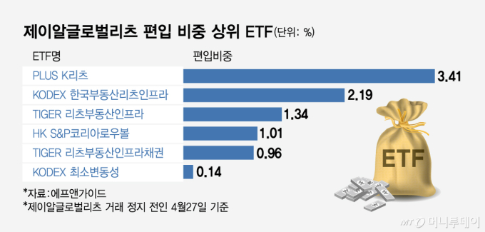 29ÀÏ ±ÝÀ¶Á¤º¸¾÷ü ¿¡ÇÁ¾Ø°¡À̵忡 µû¸£¸é Á¦À̾˱۷ιú¸®Ã÷ °Å·¡ Á¤Áö ÀÌÀüÀÎ Áö³ 27ÀÏ ±âÁØ ÇØ´ç Á¾¸ñÀ» ÆíÀÔ ÁßÀÎ ETF´Â 12°³´Ù. ÀÌ Áß °¡Àå ÆíÀÔ ºñÁßÀÌ ³ôÀº ETF´Â 3.41%¸¦ ±â·ÏÇÑ 'PLUS K¸®Ã÷'´Ù.