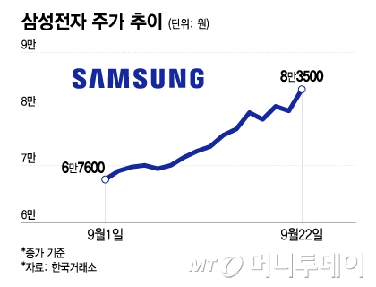 À̳¯ »ï¼ºÀüÀÚ´Â Àü °Å·¡ÀÏ ´ëºñ 3800¿ø(4.77%) ¿À¸¥ 8¸¸3500¿ø¿¡ ÀåÀ» ¸¶°¨Çß´Ù. ÀåÁß¿¡´Â 8¸¸4000¿ø±îÁö Ä¡¼Ú¾Æ 15°³¿ù¿© ¸¸ÀÇ ÃÖ°í°¡¸¦ ±â·ÏÇß´Ù. Áö³ÇØ 7¿ù23ÀÏ(8¸¸4700¿ø) ÀÌÈÄ 15°³¿ù¿©¸¸¿¡ ÃÖ°í°¡´Ù.